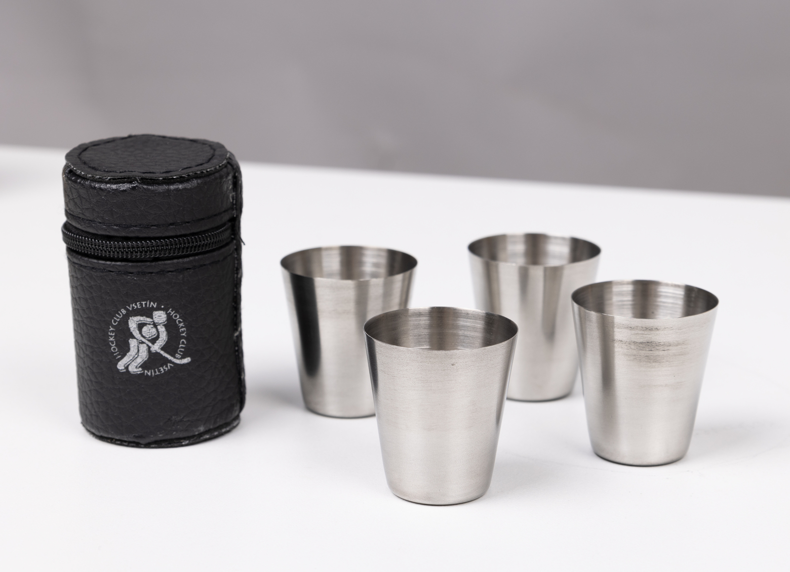 Kalíšky v potištěném koženém obalu. Počet nerezových kalíšku 4ks.