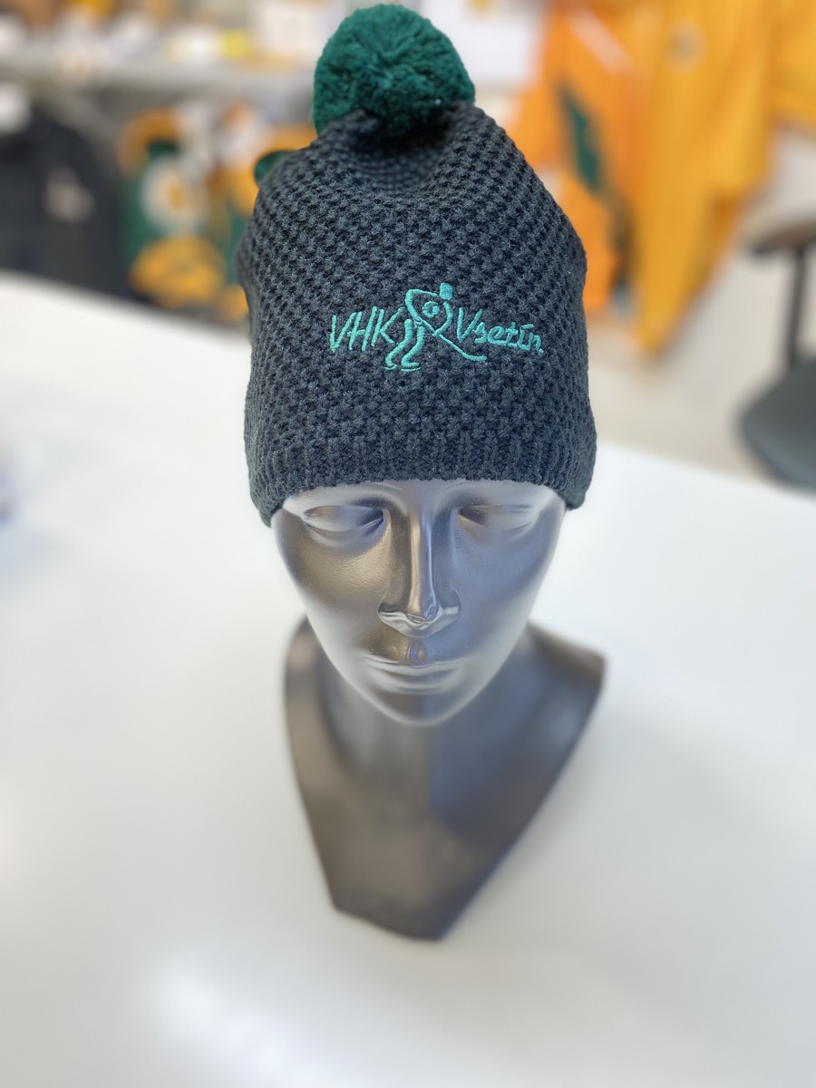 Pletený sportovní kulich se stylovou zelenou bambulí a výšivkou. Uvnitř polopodšitý fleecem.